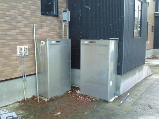 | 積雪のある北国で使用されているロードヒーティング(融雪装置)では、ボイラーを使って、灯油などを燃やした熱(お湯)で雪を解かす装置が一般的です。左の写真の様なボイラーと、雪の積雪を感知するセンサーが取り付けられています。 |