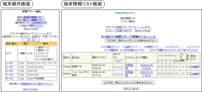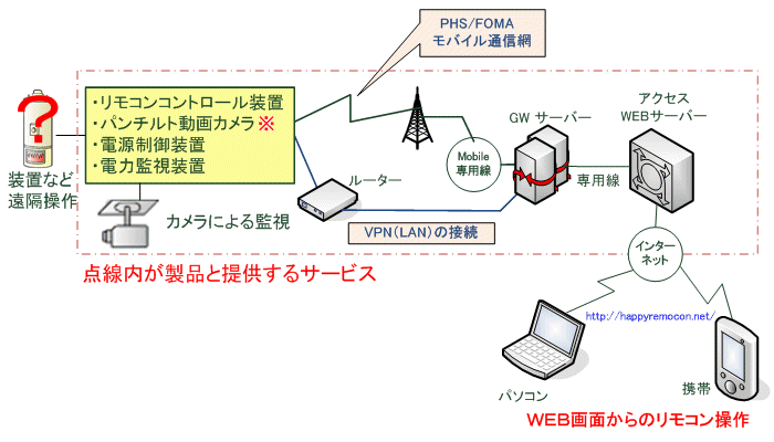 「見る、つける、けす、確認する」で、ハッピーに・・をキャッチフレーズに、「ハッピーリモコン」は、カメラで見て確認した上で、装置をつけたり、消したり、また、状況を確認したり、ボタンを押したことを知らせたり、異常を知らせたりなどを、携帯電話やインターネットから、閲覧・操作することができる遠隔操作装置を使った 遠隔操作・遠隔監視システムです。