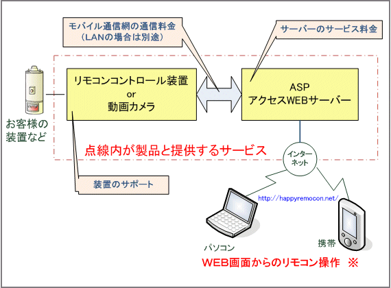 WEB画面からのリモコン操作に必要な、パソコン、携帯電話にかかる通信回線は、お客様にて準備して頂きます。 |
